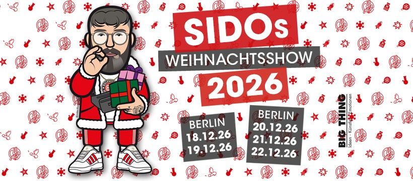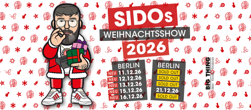 SIDO höchstpersönlich heißt auch 2026 in der festlich geschmückten Columbiahalle zur Neuauflage seiner WEIHNACHTSSHOW willkommen.